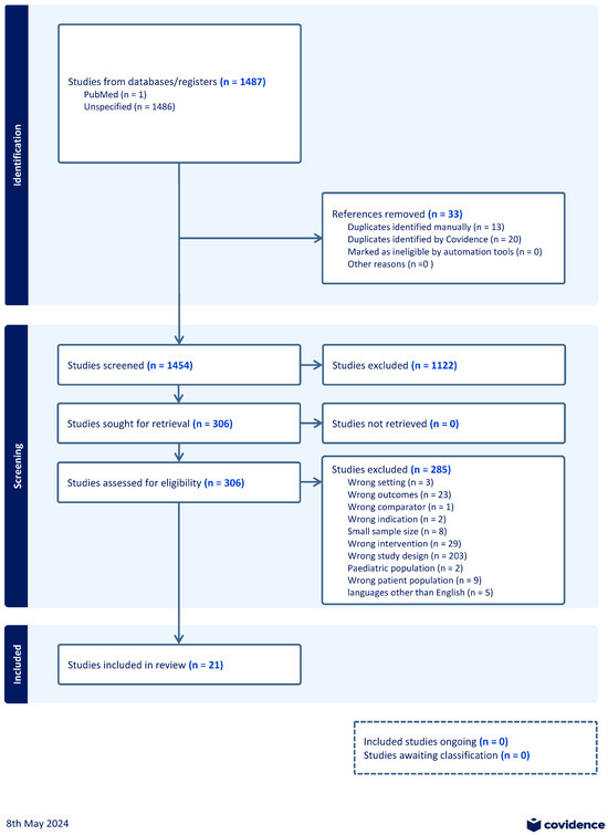 The searches in PubMed, Embase, and Scopus yielded 1487 citations. These citations were exported to Endnote (Version 20), and 33 duplicates were removed using the Endnote deduplication feature. This resulted in a total of 1454 unique citations found across all database searches. As can be seen in Figure 1, titles and abstracts of the 1454 articles were screened; 306 were selected for full-text screening. Of the 306 studies, 285 were excluded at full-text screening or during extraction attempts with the consensus of two co-authors; 21 unique eligible studies were included [22,23,24,25,26,27,28,29,30,31,32,33,34,35,36,37,38,39,40,41,42].