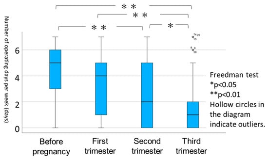 The number of operating days per week before pregnancy and at each trimester was examined and compared. The number of operating days in a week significantly decreased after pregnancy compared to before pregnancy. Notably, in the third trimester, it further decreased significantly compared to that in the first and second trimesters (Figure 2). These findings indicate that women tended to drive less frequently not only before pregnancy but also as the weeks of pregnancy progressed.
