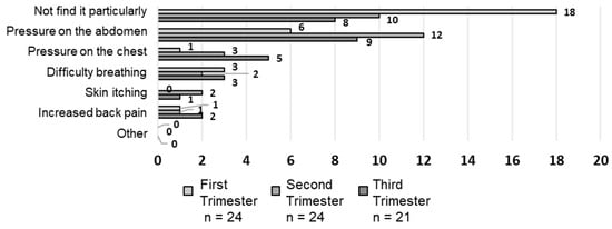 Overall, 18 (75.0%), 10 (41.7%), and 8 (38.1%) respondents in the first, second, and third trimesters, respectively, reported ‘no particular discomfort’, with a statistically significant increase in those experiencing discomfort as the pregnancy progressed (Figure 3). No statistically significant differences were observed for the other items; however, regarding the response ‘I had pressure on the abdomen’, the number increased from 6 in the first trimester (25.0%) to 12 in the second trimester (50.0%). The number of respondents who experienced chest pressure increased from the first to the third trimester. The response ‘breathing was difficult’ remained constant throughout pregnancy. Skin itching from seatbelt contact and back pain increased during the second and third trimesters.