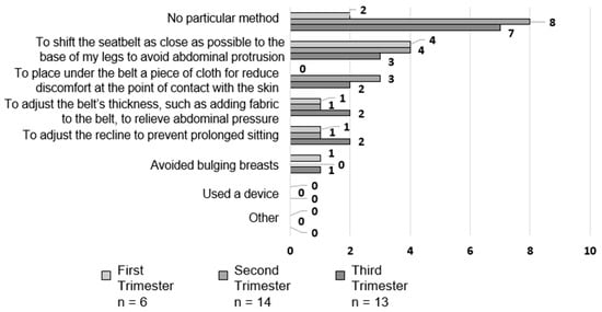 Despite the limited number of responses, several pregnant women devised methods for wearing seatbelts starting from the first trimester (Figure 4). Notably, those who ‘shifted the seatbelt as close as possible to the base of their legs to avoid abdominal protrusion’ accounted for 66.7% (4 of 6), 28.6% (4 of 14), and 23.1% (3 of 13) of respondents in the first, second, and third trimesters, respectively. Those who ‘adjusted the belt’s thickness, such as adding fabric to the belt to relieve abdominal pressure‘, ‘adjusted the recline to avoid prolonged sitting‘, and ‘avoided bulging breasts’ most likely adjusted in the first trimester. A new adaptation introduced in the second trimester or later involved placing a cloth or other material under the belt to reduce discomfort in the skin and ingestion areas.
