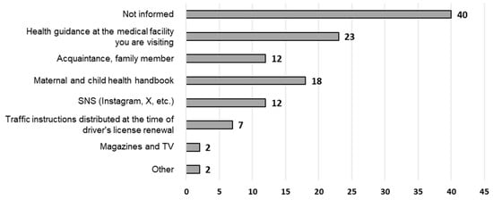 The most common source of information on seatbelt use was, ‘I have not received any information’ (40 [48.8%]) followed by ‘health guidance at the medical facility where I am receiving medical care’, ‘Maternal and Child Health Handbook’, ‘acquaintances and family’, and SNS (Figure 5). Notably, some respondents obtained information from ‘books’ as other sources.