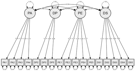 All four factors had acceptable internal consistency (>0.7) in both Cronbach’s α and McDonald’s ω reliability statistics [16,18]. This study had a sample size of 200 for validation, which was found to be adequate since KMO-MSA (0.857) and Bartlett’s test for sphericity (p < 0.001) reject the null hypothesis of the identical correlation matrix [19]. Hence, the EFA began data extraction. The item had factor loadings < 0.5 (PA5), and two other cross-loaded items (DP1 and DP4) were removed from the questionnaire [20]. On the other hand, the cumulative variance for the four-factor model was 50.8, which was higher than the threshold value [25]. Therefore, the amount of variance explained by the factors was satisfactory.
