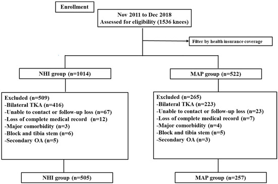 We conducted a retrospective collection of clinical data from consecutive patients who received TKA at our institute from November 2011 to December 2018. Inclusion criteria were as follows: patients (1) with symptomatic progressed primary osteoarthritis (Kellgren–Lawrence grade ≥ III) [16] and (2) who received unilateral TKA using a cemented posterior-stabilized type. The exclusion criteria were patients with loss of complete medical records and those who were followed up for less than 5 years. Patients with significant comorbidities, including severe pulmonary disorders, coagulation abnormalities, or a history of venous thromboembolism, were excluded. To minimize bias, patients with a second knee in staged bilateral TKA, secondary osteoarthritis (OA), or stem/block fixation for primary TKA were excluded from this study. Finally, 762 knees were assigned to either the NHI group (n = 505) or the MAP group (n = 257) (Figure 1). The study protocol received approval from our institutional review board (SMC 2022-01-009).