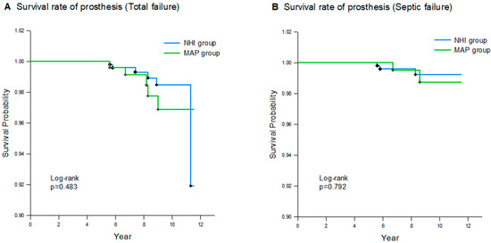 Survival rates at the 10-year follow-up were 98.5% and 96.9% for the NHI and MAP groups, respectively. The survival rates for septic failure were also calculated. In the septic failure group, the 10-year survival rates were 99.2% and 98.7% in the NHI and MAP groups, respectively. A log-rank test was performed to analyze the differences in survival curves between the groups, and no statistically significant differences were found (p = 0.48 for total failure; p = 0.79 for septic failure) (Figure 2).
