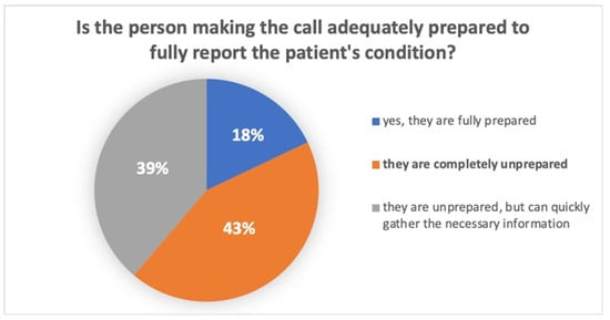 A total of 67 respondents answered Question 7, which concerned the preparedness of the person reporting the patient’s condition for ECPR qualification. Among them, 43% (n = 29) indicated that the reporting person was completely unprepared for reporting the patient’s condition. Detailed results are presented in Figure 1.