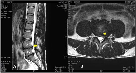 Lumbar spine MRI conducted on 18 February 2023. (A) T2-weighted turbo-spin-echo sagittal view: the arrow indicates the area of the extruded L4/5 disc, and the L5 nerve roots are abutted against the extruded disc. (B) T2-weighted turbo-spin-echo axial view: the triangle indicates the area where the disc has extruded from the central to left foraminal zone.