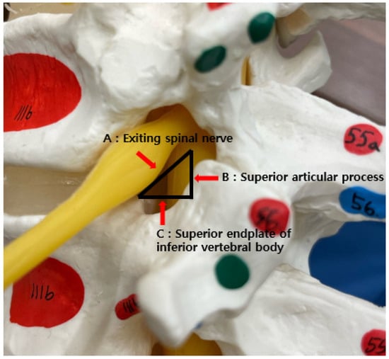 Kambin’s triangle (yellow line) bordered by the exiting nerve root ((A) hypotenuse), thecal sac ((B) height), and superior border of the caudal vertebra ((C) width).