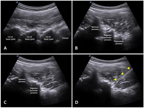 For long-axis scanning of the lumbar spine, the probe was placed on a palpable spinous process at the level of the posterosuperior iliac spine. Subsequently, the probe was moved laterally to identify the appearance of the camel-hump sign, which was determined to be the facet joint (Figure 3A). Next, the probe was moved cranially from the sacrum lying longitudinally, and the vertebral segments L5/S1 and L4/L5 were located and marked according to the order of the joints observed in this direction. From the long-axis view, the target segment for intervention (i.e., the L4–L5 facet joint) was determined, and the probe was rotated by 90° to perform short-axis scanning (Figure 3B). In the short-axis view, with the spinous process placed at the center, the probe was moved so that the superior articular process of the facet joint was displayed at the center of the screen to obtain a paramedian view. The probe was moved caudally from this position to scan the L5 transverse process (Figure 3B,C). Afterwards, the probe was moved cephalad, and the transverse process disappeared; the location for the intervention was determined in this plane (Figure 3D).