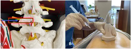 Ultrasound-guided pharmacopuncture was performed by placing one or two pillows under the patient’s abdomen and positioning the patient to reduce lordosis while securing some space behind the patient. To prevent infection, the practitioner wore latex gloves, disinfected the skin with a povidone–iodine solution, and adopted the complete aseptic technique throughout the procedure. A 26-gauge needle, which was relatively fine and caused minimal tissue damage, was used for the procedure. Additionally, the slight tingling sensation typically felt during pharmacopuncture is generally within the tolerable range for patients. Therefore, anesthesia was not administered during the treatment.