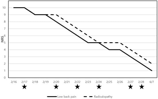 Notably, the NRS scores for LBP and radiculopathy decreased by 1 point on 17, 20, 22, 27, and 28 February, which were the dates when ultrasound-guided pharmacopuncture was administered; these data are marked with asterisks in Figure 5.