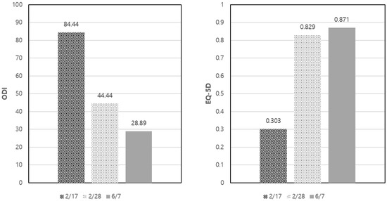 Changes in the ODI and EQ5D scores on the admission date (2/17), discharge date (2/28), and end date of outpatient treatment (6/7). ODI, Oswestry disability index; EQ5D, EuroQol five-dimension index.