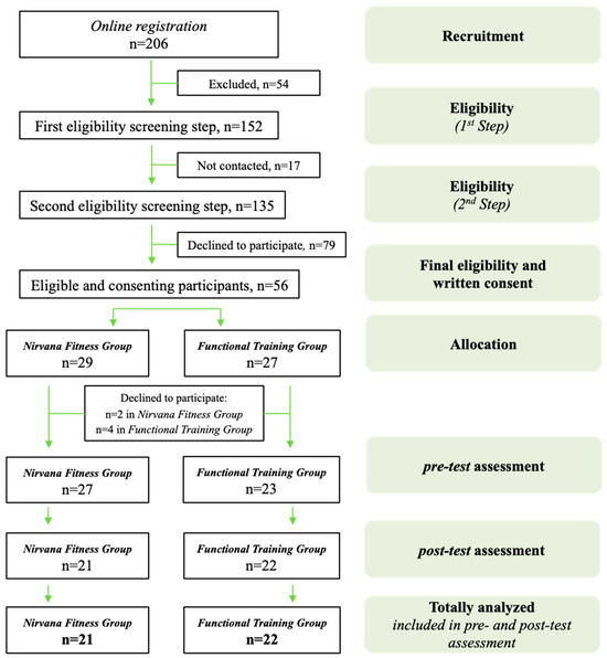 The female volunteers were recruited online using multiple strategies. The recruitment entailed strategies such as posting information on social media network accounts (university/college platforms, the official platforms of student representatives, and the personal accounts of the investigators). Moreover, we invited females to participate in the intervention through oral announcements by the investigators in classes after obtaining permission from the administrative staff in the higher school institutions. Finally, the students we registered directed other students towards the intervention and motivated them to participate. The investigators involved in the study were responsible for recruiting the participants, and they developed an invitation flyer. The online flyer contained all the necessary information, contact information for the lead investigator, and an active link for registration. Interested students were included in the registration list via an active link with a request to complete an online questionnaire. The questionnaire was considered the first eligibility screening step. Recruitment continued for three weeks. Subsequently, using the online registration form, all the females were screened for the second eligibility step with an extra phone call. Additionally, those who met the eligibility criteria were contacted via email and provided with information regarding the scheduled first in-person meeting. After in-person contact, all the eligible and consenting (we requested written consent for participation) female (sex at birth) students were emailed with confirmation of their participation and information about the upcoming first exercise session. To select the sample, the following eligibility criteria were assigned: female gender (sex at birth) and written consent before participation. The exclusion criteria were as follows: a diagnosed eating disorder, an existing musculoskeletal or other chronic condition that could be considered a barrier to exercise, participation in professional sports, and attendance at Nirvana Fitness and/or FT in the past six months.