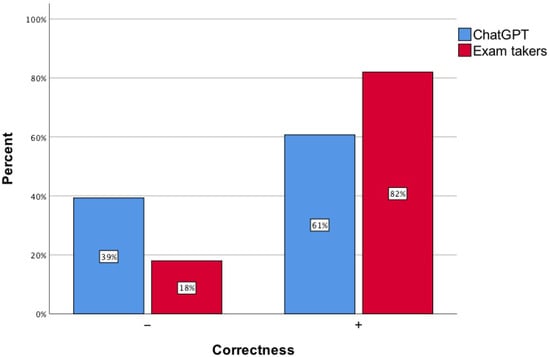 The accuracy of the correct answers provided by the artificial intelligence tool hovered around 60% (Figure 1). This was lower compared to the percentage of correct answers given by exam takers (p < 0.001; ø = 0.24).