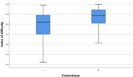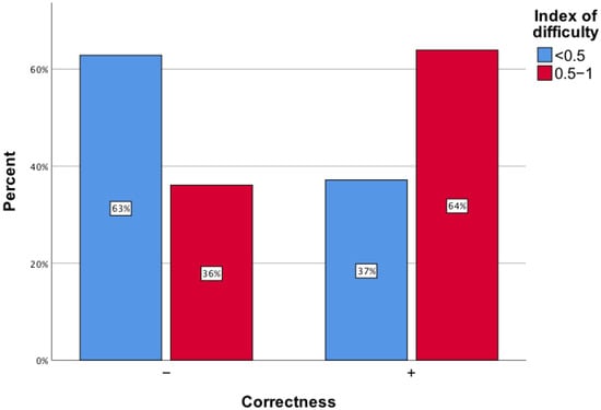 The difficulty index of the questions showed a statistically significant relationship with the correctness of responses (eta = 0.69; p = 0.04). This indicates that the difficulty index moderately influences whether an answer is correct. In other words, more difficult questions tend to result in a higher number of incorrect responses. Confirmation of these findings is evidenced by a statistically significant difference between incorrect versus correct responses to questions in terms of their difficulty index (p < 0.001). A lower difficulty index corresponds to more difficult questions. Incorrect responses were more frequent for questions with higher difficulty (Figure 2).