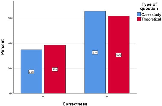 Among the analyzed questions, 101 were case studies, while the remainder were theoretical. There were no differences found in the percentage of correct responses provided by the artificial intelligence tool for theoretical questions versus case studies (p = 0.46) (Figure 4).
