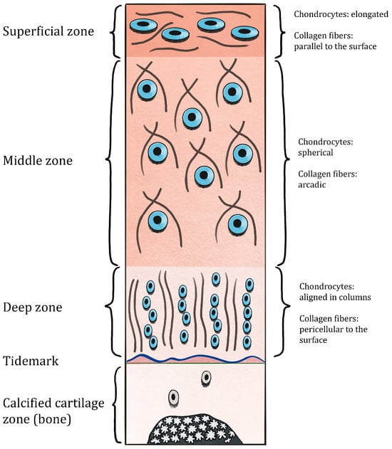 The calcified zone is composed of hydroxyapatite, which serves as a barrier between the rigid bone and the pliable cartilage, reducing a mechanical gradient []. The layered architecture of cartilage is presented in Figure 1.