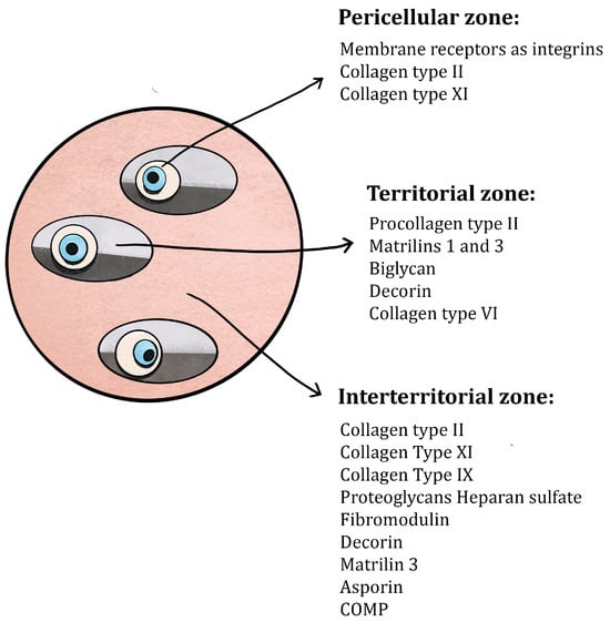 Cross-sectional view of ECM, with a division into pericellular, territorial, and interterritorial cartilage sections.