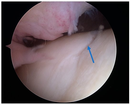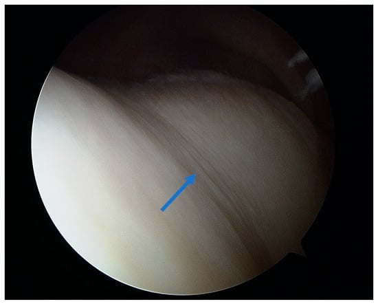 Arthroscopic view of grade III lesion with a visible cartilage deficit of less than 50% (arrow) in the femoral trochlear groove.