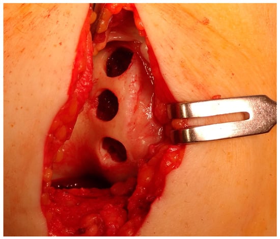 Intraoperative view of donor site preparation for osteochondral blocks implantation on the lateral femoral condyle.