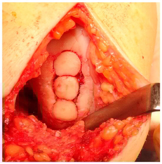 Osteochondral autograft transplantation (OAT) involves the transplantation of grafts obtained from the non-weight-bearing areas of the joint to the injured regions that bear more weight []. The application of autograft results in a more expedited and dependable process of osseous integration compared to the osteochondral allograft. Furthermore, the autograft presents several advantages, including convenient accessibility to donor cartilage, capacity for addressing lesions of different sizes, and utilization of the native hyaline cartilage containing functional and fully developed chondrocytes [,]. Good results of OATS have been described for small defects (<2 cm2), but larger defects ranging from 2 to 4 cm2 can also be treated beneficially with this method, especially in young, demanding patients []. This technique is the first line of treatment for cartilage lesions involving the subchondral layer []. The histologic examination of the transplanted osteochondral graft has revealed that in an ideal OATS, the grafts are successfully integrated into the defects to preserve the structural integrity of the hyaline cartilage and cancellous bone. This integration also ensures the maintenance of a smooth and congruent articular surface in the weight-bearing regions [,]. Intraoperative views of the OATS procedure are shown in Figure 8 and Figure 9.
