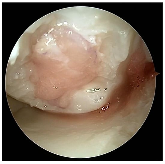 Full-thickness articular cartilage lesions hardly ever heal on their own [,]. Numerous techniques have been employed to activate bone marrow in the history of cartilage repair. A complete injury of the hyaline cartilage in a weight-bearing region between the femur and the tibia or in the patellofemoral joint is a common indication for microfracture. The indications for the microfracture technique are usually small lesions up to 2 cm2 without subchondral involvement. Exceptionally, it can be used for larger defects (>3 cm2) in less demanding patients []. The location of the lesions is also crucial, with much better results achieved at the femoral condyles than at the patellofemoral joint []. The microfracture (MFX) technique was extensively researched and developed by Steadman [,]. Over the years, advancements [] have been made in the method, resulting in many improvements. These enhancements include removal of the calcified subchondral bone [], establishment of straight and uniform cartilage margins [] and execution of microfractures in close proximity to one another []. The perforation of the subchondral bone plate releases liquid bone marrow. Depending on the size of the awl/drill used for bone marrow stimulation, nanofractures with the use of 1 mm drills can be distinguished in this technique. Figure 7 shows the arthroscopic view of the medial femoral condyle with microfractures (MFX). The roughened surface produced by the surgeon provides an area to which the marrow clots can firmly adhere [,]. Mesenchymal stromal cells (MSCs) that are introduced into the damaged region have the ability to undergo differentiation into fibrochondrocytes. These fibrochondrocytes then proceed to occupy the defect and subsequently undergo remodeling, resulting in the formation of a fibrocartilage clot []. Nevertheless, the abundance of mesenchymal stromal cells is very limited and diminishes with an individual’s aging []. The composition of the clot primarily consists of type I collagen, which distinguishes it from the natural hyaline cartilage that predominantly comprises type II collagen []. Type II collagen possesses a higher concentration of hydroxylysine and a much greater amount of glycosylated hydroxylysine compared to type I collagen. These additional residues might confer distinctive physical characteristics onto type II fibrils []. Histological examinations of the tissue-healing process subsequent to microfracture surgery have revealed the predominant presence of fibrocartilage. In other cases, a hybrid repair tissue has been observed, characterized by varying levels of proteoglycan and type II collagen [,]. In contrast to hyaline cartilage, fibrocartilage has mechanical qualities that are less optimal for enduring the prolonged stresses associated with joint-loading, owing to its softer nature and lower capacity for tolerating shear stress []. The cells present in the fibrous tissue have an elongated phenotype resembling fibroblasts, both in terms of their physical form and the profile of genes they express. The matrix exhibits a reduced concentration of glycosaminoglycans and a higher presence of type I collagen [,]. Ebenstein et al. [] reported that fibrous repair cartilage exhibited a contact stiffness of 0.03 ± 0.01 kN m−1, which was approximately one order of magnitude lower than the contact stiffness of the healthy cartilage (0.17 ± 0.039 kN m−1). The lower compression stiffness could explain the lower resilience of the fibrous repair cartilage to mechanical load [].