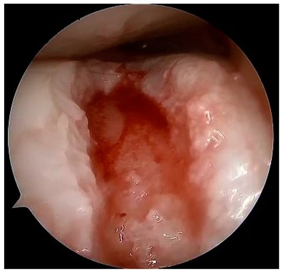 At the macroscopic level, alterations in the composition of the cartilage matrix coincide with the emergence of surface fibrillations, which are characterized by the presence of microscopic cracks in the superficial zone. As OA advances, these cracks contribute to the detachment of cartilage fragments and the development of fissures that expand into the deeper layers of cartilage. Subsequently, the deep fissures within the affected cartilage cause its delamination, exposing the underlying zones of the calcified cartilage and subchondral bone [,,]. Figure 3, Figure 4, Figure 5 and Figure 6 show the course of cartilage loss in a knee joint according to the ICRS [] grading system. These changes include an increase in the volume, thickness, and outline of the cortical plate, as well as changes in bone mineralization and material characteristics. Additionally, OA is associated with changes in the architecture and mass of the subchondral trabecular bone, the development of bone cysts, and the presence of bone marrow lesions and osteophytes [,,]. Subchondral bone cysts are frequently observed in individuals with advanced osteoarthritis. A concept has been developed that cysts are created within the subchondral bone, specifically at places where previous bone marrow lesions are present. This observation suggests that the development of cysts is directly linked to bone damage and necrosis, which, in turn, triggers the process of osteoclast-mediated bone resorption, ultimately resulting in cyst formation []. Osteophytes may potentially play a role in joint stabilization rather than actively contribute to the advancement of joint disease. Certainly, the elimination of osteophytes has been seen to result in increased joint instability in animal models of osteoarthritis []. Moreover, it is worth noting that no discernible correlation exists between the advancement of knee OA and the dimensions of osteophytes in human individuals with OA [].
