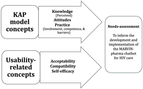 Drawing on a conceptual framework and existing instruments, this study aimed to better understand the needs of pharmacists in HIV care and their perceptions of the MARVIN-Pharma chatbot (in development) as a tool to reduce their challenges in HIV care. Specifically, it sought to characterize their knowledge, attitudes, and practices tied to HIV care, as well as the chatbot’s usability, in terms of its acceptability, its compatibility, and pharmacist self-efficacy.