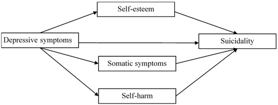 However, few studies have tested the mediating effects of somatic symptoms, self-harm, and self-esteem in the relationship between depression and suicidality in community-based adolescents. Although previous studies have explained depression [11,25,34], self-harming behavior [25,35], somatic symptoms [13,25], or self-esteem [28,30,36] as predictors of adolescent suicidality, it is difficult to understand the relationship between these variables clearly. Therefore, this study aimed to explore the mediating effects of self-harm, somatic symptoms, and self-esteem in the relationship between depressive symptoms and suicidality using survey data from community-dwelling adolescents aged 10–18 years in Korea. In this regard, the following hypotheses were proposed: