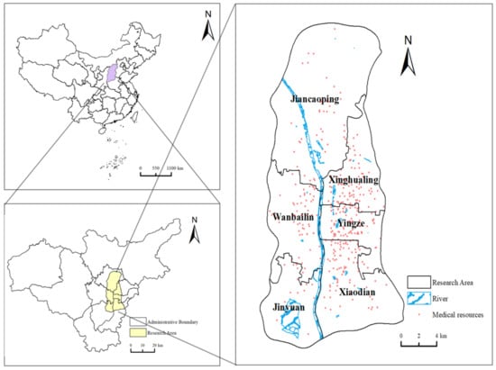 Taiyuan, the capital of Shanxi Province, is currently divided into 6 districts, 3 counties, and 1 county-level city. Taiyuan is the political, economic, cultural, and international center of Shanxi Province and is also one of China’s important energy and heavy industry bases. This article selects the central urban area of Taiyuan City in Shanxi Province as the research area. The scope of Taiyuan’s central urban area is defined in the “Taiyuan City General Urban Planning (2011–2020)”, which includes parts of the six urban districts. It is surrounded by an encircling expressway, covering an area of about 334 square kilometers. The region covers most of Taiyuan City’s population and medical resources, as shown in Figure 1.