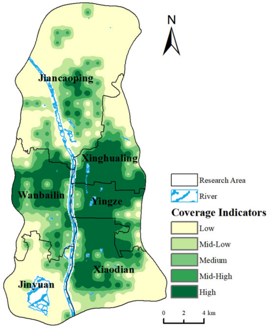 From Figure 4, it can be seen that the overall trend of the medical service coverage rate index values aligns closely with the isochrone coverage results for residents’ major and routine medical orientations. Areas with higher coverage rates are concentrated in the central region of the study area, the south–central area of Jiancaoping District, and the northern area of Xiaodian District. This result reflects that the nearby tertiary and general hospitals are numerous and capable of providing comprehensive medical services.
