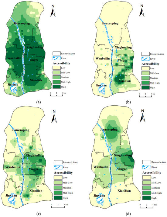 Results of accessibility for four transportation modes. (a) Driving accessibility; (b) riding accessibility; (c) walking accessibility; and (d) public transportation accessibility.