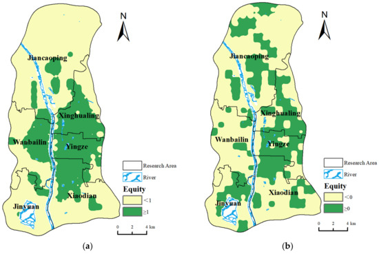 Results of equity indicators for medical facilities. (a) Equity in geographic factors and (b) equity in population factors.