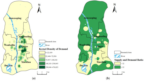 Results of supply and demand ratio index of medical resources. (a) Kernel density of demand information and (b) results of supply and demand ratio.