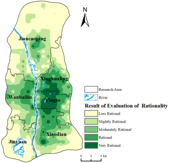 In summary, the findings reveal significant spatial heterogeneity in the rationality of medical resource allocation within the central urban areas of Taiyuan, showing distinct regional differences among districts and counties (see Figure 9). The rationality of medical resource allocation is influenced by factors such as geographical location, economic development, transportation, and population density. The most rational allocations are found in economically developed and transit-accessible areas such as the Yingze and Xinghualing districts. In contrast, Jinyuan District and Jiancaoping District, located in the north and south, respectively, have fewer medical resources. Due to smaller populations, larger geographical areas, and greater distances from the central district, some areas experience inadequate medical allocation. Additionally, the internal regions of Wanbailin District and Xiaodian District display varying levels of rationality, indicating a relatively uneven allocation of internal rationality (see Figure 3, Figure 4, Figure 5, Figure 6, Figure 7, Figure 8 and Figure 9).