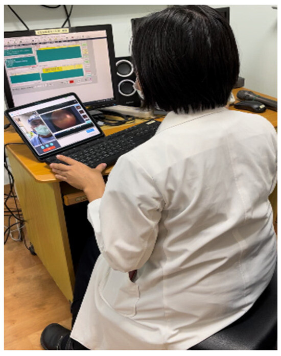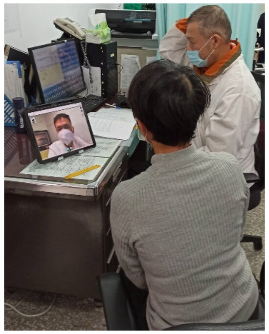 The process of consultation for teleophthalmology is (1) the personnel at the health station informs patients the date and time for teleconsultation in advance as well as helps them make an appointment; (2) on the day of the appointment, the nurse at the health station uses a tonometer to measure patients’ vision and intraocular pressure (Figure 2) and takes images with a slit lamp and fundus camera (Figure 3); (3) the doctor at the health station makes an inquiry and connects with the medical center for teleophthalmology (Figure 4); (4) the doctor at the health station shares the patient’s basic physiological information as well as the slip lamp and fundus camera images with the specialist at the medical center for diagnosis (Figure 5); (5) the specialist at the medical center starts the teleconsultation by video conferencing system with the patient (Figure 5); (6) the specialist at the medical center informs the patient the result of diagnosis and asks the doctor at the health station to prescribe medication (Figure 5); (7) virtual visit is completed, and the remote joint teleconsultation ends.
