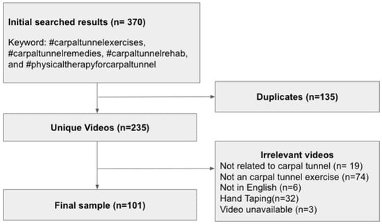 The social media platform, TikTok, was queried to find videos related to carpal tunnel exercises on 24 April 2023. The search used the hashtags “#carpaltunnelexercises”, “#carpaltunnelremedies”, “#carpaltunnelrehab”, and “#physicaltherapyforcarpaltunnel” without any search filters. Thus, through our search terms, we intended to capture most of the videos that a TikTok user would most likely encounter when searching the platform for CTS-related exercises. The search yielded many videos (n = 370). We then performed an initial screening of the videos to eliminate those that were (1) duplicates (n = 135), (2) not related to CTS (n = 20), (3) not related to carpal tunnel exercises (n = 74), (4) not in English (n = 6), (5) pertaining to hand taping (n = 32), and (6) unavailable (n = 3). After the screening, 101 videos remained for the data analysis (Figure 1).