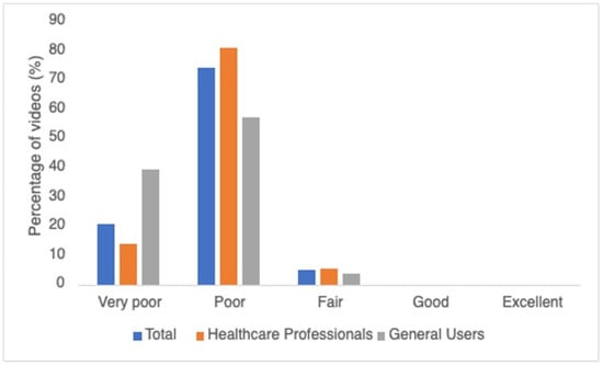 The DISCERN grading results are shown in Figure 2. General users had slightly more videos graded as very poor (n = 11, 52%) than healthcare professionals (n = 10, 48%). More videos uploaded by healthcare professionals were graded as poor (n = 59, 79%) than general users (n = 16, 21%). General users had fewer videos graded as fair (n = 1, 20%) than healthcare professionals (n = 4, 80%). However, no videos between the two groups were graded as good or excellent.