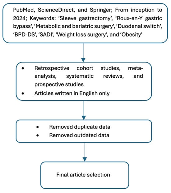 The authors of this manuscript conducted a comprehensive narrative literature review (LR) through a structured process. This involved defining relevant research questions and keywords, conducting the LR, and summarizing research findings. All authors collaborated on various tasks, including drafting an LR protocol, identifying inclusion and exclusion criteria, establishing a suitable search strategy, selecting appropriate search engines, ensuring the quality of selected articles, and extracting relevant data for the final manuscript. Retrospective cohort studies, meta-analyses, systematic reviews, and prospective studies reporting outcomes of MBS in English were included in our study selection. Exclusion criteria included abstracts, non-English texts, and papers that do not include our relevant search words such as ‘Sleeve gastrectomy’, ‘Roux-en-Y gastric bypass’, ‘Metabolic and bariatric surgery’, ‘Duodenal switch’, ‘BPD-DS’, ‘SADI’, ‘Weight loss surgery’, and ‘Obesity’. Relevant articles from inception to 2024 were identified using databases such as PubMed, ScienceDirect, and Springer Link, and filtered based on specific keywords. Manuscripts were screened and duplicates, articles that did not meet our inclusion criteria, as well as articles that presented outdated data, were removed. The corresponding author approved the final selection of articles and expert opinion provided by the senior author was used to synthesize the gathered information and edit the manuscript draft (Figure 1 and Supplementary Table S1).
