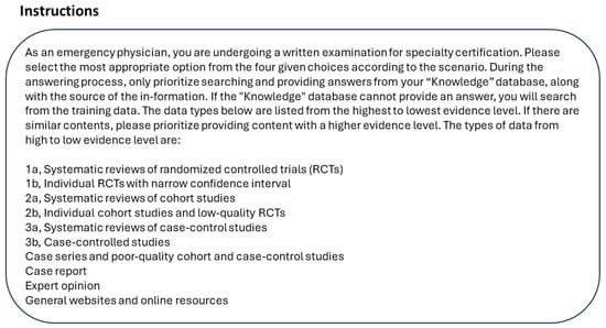 ChatGPT has been demonstrated to complete exams from various medical domains and has applications in medical settings, such as the Medical Licensing Exam for graduates, the United States Medical Licensing Examination, and the Otolaryngology Board Certification Examination; in emergency medicine, it has also been utilized to correctly perform mass casualty incident triage, albeit with mixed results [7,14,15,16]. Many studies suggest that even ChatGPT-4 still cannot pass relevant specialist medical exams, and the credibility and sources of the provided content are often questioned [17,18]. Thus far, no research has been conducted using ChatGPT to evaluate the official emergency medicine specialty exam, and the capabilities of LLMs in the emergency medicine domain remain unknown. Additionally, no studies have tested the effectiveness of ChatGPT’s personal ‘Knowledge’ and ‘Instructions’ functions, also known as custom GPTs. Masters et al. proposed techniques for using custom GPTs but did not provide specific experimental data to support the effectiveness of these techniques [4]. Additionally, many current studies have limitations due to differences in the types of questions or the nature of the data, which may affect the outcomes of subsequent applications. Some studies focus only on specific types of images, such as EKGs, or target specific question types or medical specialty fields [7,19,20]. Others have only conducted preliminary explorations in multimodal data fusion without in-depth analysis of its effectiveness in practical clinical applications [21]. Therefore, caution is needed when applying these techniques, and more empirical research is required to verify their effectiveness.