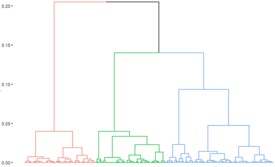 Dendrogram representing the 3 clusters of nursing homes (EHPADs) obtained through hierarchical classification. Each cluster is shown here in a different color: red for cluster 1, green for cluster 2 and blue for cluster 3. French COVID-19 nursing homes survey, 2020.