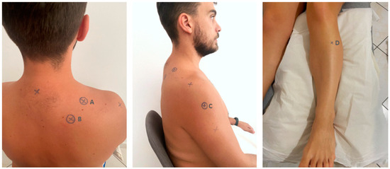A pressure algometer (Somedic AB, Farsta, Sweden) was used for the measurements. PPT was measured over 3 sites on the shoulder area and 1 distant point randomly using the website https://www.random.org/ accessed on 15 March 2022 (Figure 1). The testing sites were located (A) at the affected or dominant side in the upper trapezius (in the middle of the distance between the C7 spinous process and the acromion [30,40], (B) the levator scapulae (2 cm above the lower insertion of levator scapulae located in the upper medial border of the scapula) [30], (C) the middle deltoid (in the middle of the distance between the acromion and the deltoid trochanter) [40], and the opposite side 5 cm distal to tuberositas tibia in the belly (the thickest portion of the muscle) of tibialis anterior muscle [41] (Figure 1).
