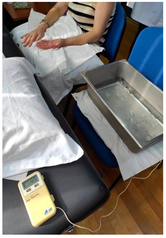 When the participants removed the hand from the water, they were instructed to rest it on a soft towel without rubbing it so as not to receive strong stimuli or a sudden increase in the temperature of the hand. The water was maintained at a constant temperature of 4 °C [44]. Two minutes after the immersion of the hand, a new PPT was delivered. After a 20 min rest period, the CPM procedure was repeated by the same rater in order to assess the intra-rater reliability (Figure 4). A CPM index was calculated as the percent ratio of the mean PPTs after the CPTs (after the immersion) to PPTs before CPTs.