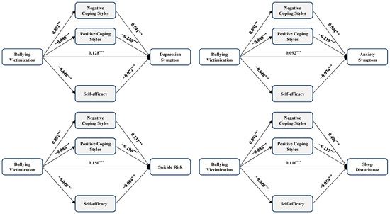 The four mediation models examining bullying victimization and mental health indicators (see Table 3 and Figure 1) revealed the following total effects: bullying victimization was positively associated with depression (β = 0.203, 95% CI = 0.186~0.223, p < 0.001), anxiety (β = 0.161, 95% CI = 0.144~0.182, p < 0.001), suicide risk (β = 0.198, 95% CI = 0.180~0.218, p < 0.001) and sleep disturbance (β = 0.161, 95% CI = 0.143~0.181, p < 0.001). The total indirect effect between bullying victimization and depression (β = 0.075, 95% CI = 0.064~0.086, p < 0.05), anxiety (β = 0.069, 95% CI = 0.059~0.080, p < 0.05), suicide risk (β = 0.049, 95% CI = 0.042~0.055, p < 0.05), and sleep disturbance (β = 0.057, 95% CI = 0.042~0.059, p < 0.05) explained 37%, 43%, 25%, and 35% of the total effect, respectively. The bootstrap results with 5000 resamples showed indirect effects of coping styles and self-efficacy, and 95% of CIs did not contain zero. Thus, coping styles and self-efficacy significantly mediated the effect of bullying victimization on depression, anxiety, suicide risk, and sleep disturbance.