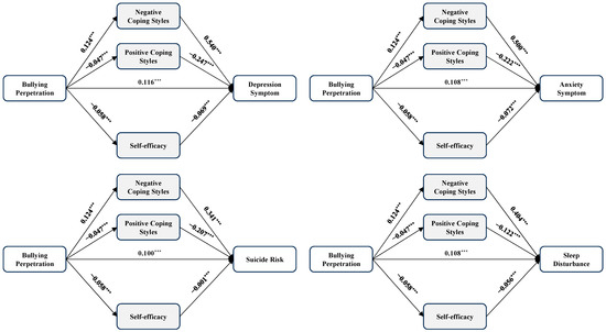 The relationship between bullying perpetration and mental health indicators was examined through another four mediation models (see Table 4 and Figure 2). The total effects of bullying perpetration on depression (β = 0.199, 95% CI = 0.180~0.217, p < 0.001), anxiety (β = 0.185, 95% CI = 0.166~0.203, p < 0.001), suicide risk (β = 0.152, 95% CI = 0.132~0.170, p < 0.001), and sleep disturbance (β = 0.167, 95% CI = 0.148~0.186, p < 0.001) were observed. The total indirect effect between bullying perpetration and depression (β = 0.082, 95% CI = 0.072~0.093, p < 0.05), anxiety (β = 0.076, 95% CI = 0.070~0.086, p < 0.05), suicide risk (β = 0.052, 95% CI = 0.045~0.059, p < 0.05), and sleep disturbance (β = 0.059, 95% CI = 0.051~0.067, p < 0.05) explained 41%, 41%, 34%, and 45% of the total effect, respectively. Thus, coping styles and self-efficacy significantly mediated the effect of bullying perpetration on depression, anxiety, suicide risk, and sleep disturbance.