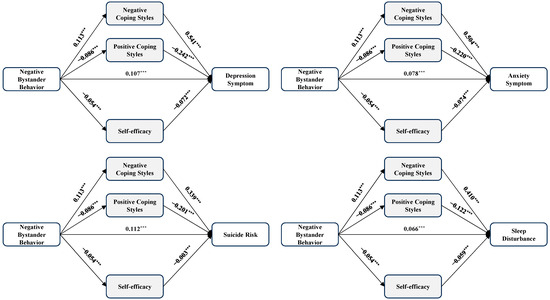 The mediation model of negative bystander behavior, coping styles, self-efficacy, and four outcomes. Note: n = 10,713, *** p < 0.001.