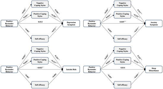 The models assessing positive bystander behavior presented a different perspective (see Table 6 and Figure 4). The total effects of positive bystander behavior on mental health outcomes were as follows: depression (β = −0.011, 95% CI = −0.029~0.008, p > 0.05), anxiety (β = 0.013, 95% CI = −0.006~0.031, p > 0.05), suicide risk (β = −0.039, 95% CI = −0.058~−0.020, p < 0.001), and sleep disturbance (β = −0.002, 95% CI = −0.021~0.017, p > 0.05). Except suicide risk, none of the other three mental health outcomes were significantly predicted. The total indirect effects of positive bystander behavior on mental health variables were also examined: depression (β = −0.024, 95% CI = −0.035~−0.014, p < 0.05), anxiety (β = −0.022, 95% CI = −0.032~−0.012, p < 0.05), suicide risk (β = −0.018, 95% CI = −0.025~−0.011, p < 0.05), and sleep disturbance (β = −0.016, 95% CI = −0.024~−0.008, p < 0.05). However, all indirect effects of self-efficacy alone were not significant for the four relationships. These findings suggested that coping styles, and self-efficacy partially mediated the relationship between positive bystander behavior and mental health outcomes.