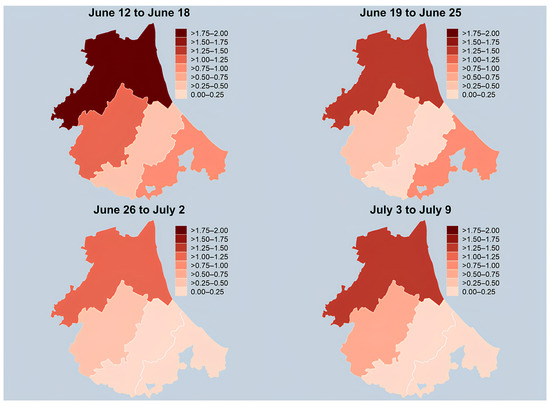 The overall data generated by the 16 family doctors included in the final analysis, encompassing all LHA districts, indicate that 86 individuals exposed to contaminated water over the age of 14 out of a total population of 24,433 (3.52 per 1000) experienced symptoms during the study period, which spanned from 12 June to 9 July 2023. The weekly average of reported cases was 21.5 (Table 1).