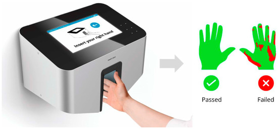 One device focusing on hand hygiene education is the Semmelweis System (Handinscan Zrt. Debrecen, Hungary), a CE-marked training tool designed to educate users on proper hand disinfection techniques by providing visual feedback on appropriately versus inappropriately disinfected areas of the hand, as earlier validated and described [15,23,24]. The device generates a digital-image-based evaluation of the hand surface coverage using an ultraviolet-dye-labeled alcohol-based disinfectant and can objectively quantify the extent of hand coverage. Artificial intelligence-based image processing identifies missed areas and calculates the percentage of the hand surface coverage.