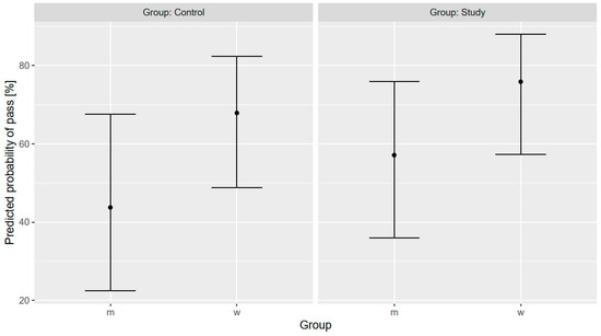 Figure 3 displays the PP of achieving a minimum coverage of 95% on hand scans, categorized by the type of HH education received and by sex. In both groups, women had a higher predicted probability of passing the scan compared to men. For female participants, the PP of passing the hand scan was 67.9% (95% CI 48.9–82.4%) in the control group compared to 75.9% (95% CI 57.3–88.0%) in the intervention group. In contrast, male participants demonstrated a significantly lower PP of passing, with a more pronounced difference between the groups: 43.8% (95% CI 22.5–67.6%) in the control group versus 57.1% (95% CI 36.0–76.0%) in the intervention group.