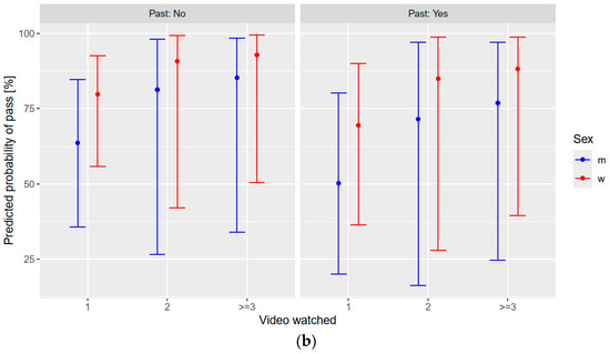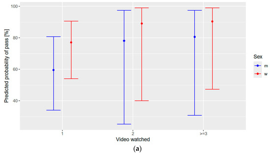 Figure 4a shows the PP of passing the hand scan in the intervention group, based on the number how often participants watched the video. For male participants, the PP increased from 59.5% (95% CI = 34–80.8%) to 78,1% (95% CI = 25.1–97.4%) when the video was watched twice compared to just once. Similarly, for female participants, the PP rose from 77.1% (95% CI = 54–90.6%) to 89,1% (95% CI = 40.0–99.0%) under the same conditions. However, the increase in PP when watching the video three or more times was relatively modest, reaching 80,6% (95% CI = 30.7–97.5%) for male participants and 90.5% (95% CI = 47.3–99.1%) for females. On average, the participants watched the video 1.65 times (range: 1–10 times).